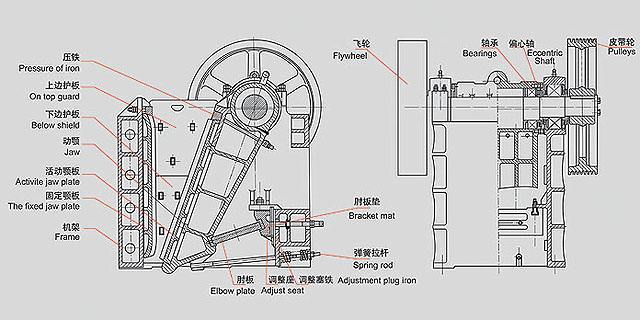 鄂式破碎機的結構主要有機架、偏心軸、大皮帶輪、飛輪、動鄂、側護板、肘板、肘板后座、調隙螺桿、復位彈簧、固定鄂板與活動鄂板等組成,其中肘板還起到保險作用。 該系列鄂式破碎機破碎方式為曲動擠壓型,電動機驅動皮帶和皮帶輪,通過偏心軸使動鄂上下運動,當動鄂上升時肘板和動鄂間夾角變大,從而推動動鄂板向定鄂板接近,與此同時物料被擠壓、搓、碾等多重破碎;當動鄂下行時,肘板和動鄂間夾角變小,動鄂板在拉桿、彈簧的作用下離開定鄂板,此時已破碎物料從破碎腔下口排出,隨著電動機連續轉動破碎機動鄂作周期性的壓碎和排料,實現批量生產。