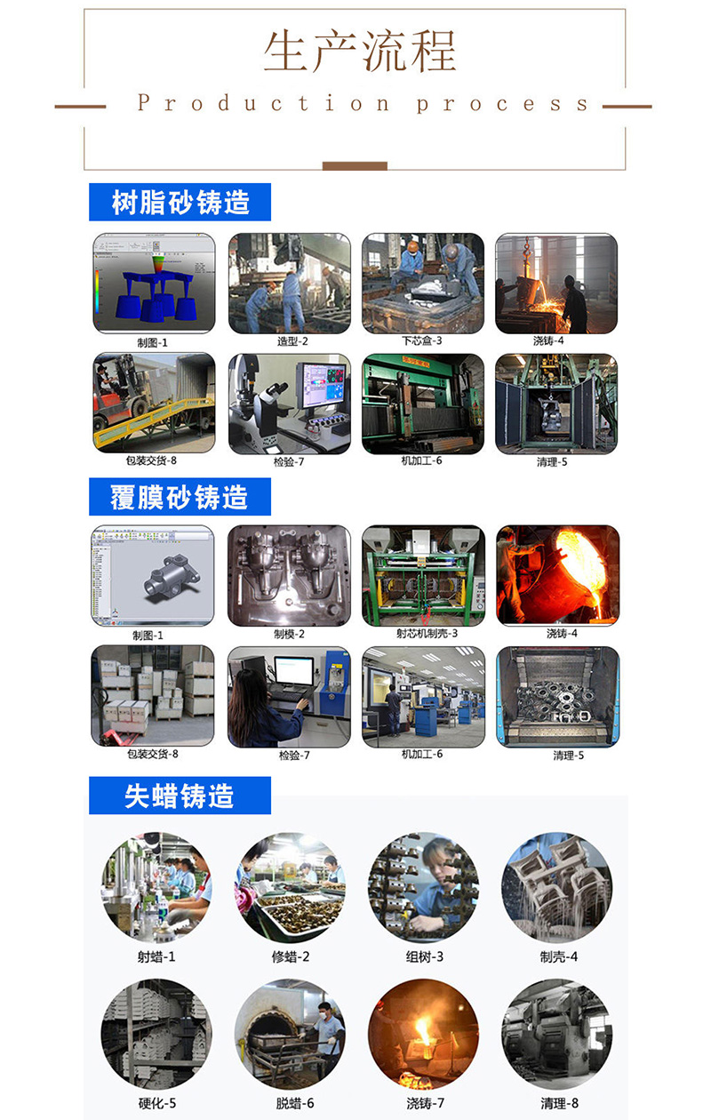 生產(chǎn)設(shè)備:樹脂砂鑄造、覆膜砂鑄造、失蠟鑄造、中頻電爐、爐前分析儀、退火爐等。